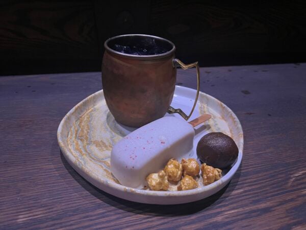 That being said, one of the members of our group ordered the Treasure Trove, which Disney describes as “A mysterious Ube, Lemon, and Coconut Concoction served with a Vanilla Cake Plank, Chocolate Cannonball, and Golden Caramel Popcorn.”